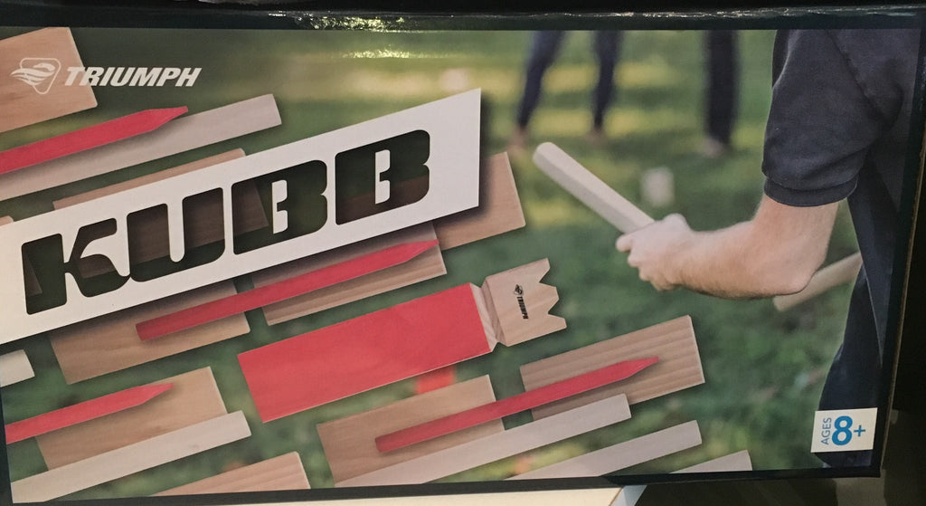 Viking chess. Described as a combination of bowling and horseshoes. The object of the game is to knock the "King" over before the opposing team does. Teams must use wooden tossing dowels to successively knock over the opponents Kubbs. After all of the opposing team's Kubbs have been eliminated, the team can then attempt to knock down the King and win the game. Set includes 10 6" x 2.75" Kubb blocks, six 1.5" x 12" Kubb tossing dowels, one 12" x 3.5" king Kubb, and four corner pegs – all made of 100% kiln dried hardwood.